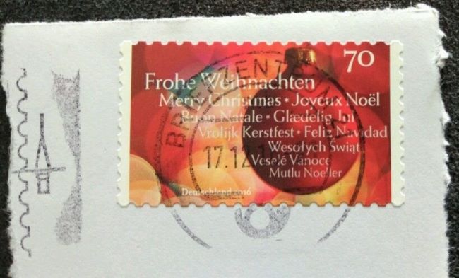 | Das Sammelgebiet Deutschland ist um eine unverausgabte Marke reicher: Die Weihnachtskugel-Marke 2016 mit Rechtschreibfehlern. Am 2. November 2016 sollte die zuschlagsfreie Sondermarke "Weihnachtskugel" erscheinen. Kurzfristig wurde die Marke (nassklebend und selbstklebend im Zehner-Markenset) nicht ausgegeben, wegen drei Rechtschreibfehlern. Jetzt sind die ersten Unverausgabten aufgetaucht! "Frohe Weihnachten" wurde auf dem Motiv in neun weiteren Sprachen wiederholt. Bei der dänischen und der niederländischen Schreibweise gab es Probleme: Glædelig Jul, statt Glædelig jul.