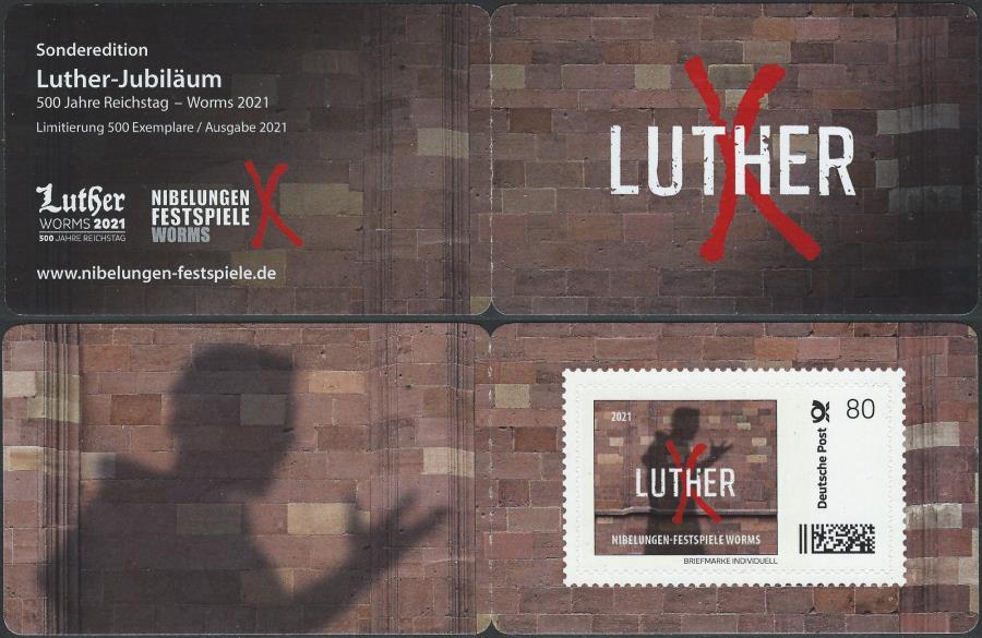 Die „Briefmarke individuell Luther“ ist im Markenheftchen zum Preis von 7,50 Euro mit Sonderstempel erhältlich, der Nominalwert beträgt 80 Cent. Auf Büttenpapier ist die Marke für 10 Euro erhältlich. Die Auflage ist insgesamt limitiert auf 500 Exemplare. Die Briefmarke ist am Tag der Premiere, am 16. Juli 2021, mit Sonderstempel im Sonderstempelpostamt im Wormser Theater erhältlich.
