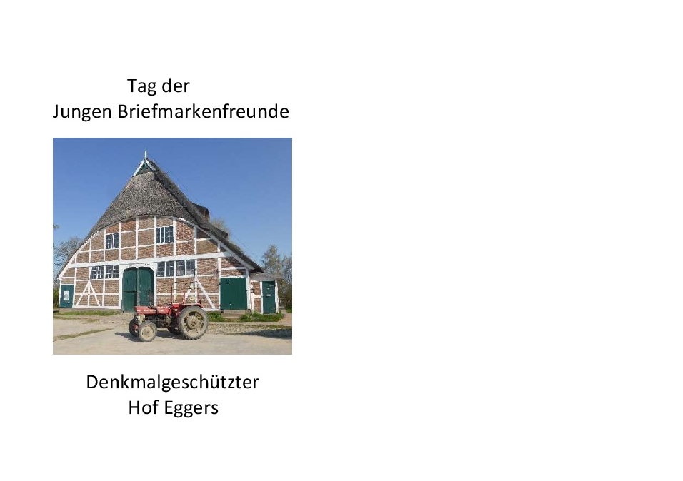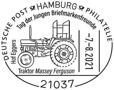 Im Rahmen einer Zentralveranstaltung zum „Tag der Jungen Briefmarkenfreunde“ (TdJB) präsentieren die Jungen Briefmarkenfreunde Bergedorf mit Unterstützung der Jungen Briefmarkenfreunde Simeon-Hamm am 7. August 2021 den Sonderstempel mit dem Motiv „Massey Ferguson“ auf Hof Eggers, Kirchwerder Mühlendamm 5, 21037 Hamburg. Wer das erste Mal in die Vier- und Marschlande kommt, wird kaum glauben, dass er sich noch in Hamburg befindet. Hier wird noch heute Ackerbau und Viehzucht betrieben. So auch auf dem Bio-Hof Eggers, der seit 1628 im Familienbesitz ist. Hier wird biologische Landwirtschaft und artgerechte Tierhaltung betrieben. Die hofeigenen Produkte können im Hofladen erworben und im Hofcafé verzehrt werden. Zudem gibt es gerade für „Stadtkinder“ viel zu Bestaunen. Dazu gehören nicht nur viele Tiere, sondern auch ein alter Traktor von Massey Ferguson, der zugleich Motiv des Sonderstempels der Zentralveranstaltung ist. Neben den Hofattraktionen gibt es jede Menge zu erleben: Eine Briefmarkenschau, ein „Riesen-Vier-gewinnt“, ein Glücksrad (jeder Dreh gewinnt) sowie eine Schatzkiste mit mehr als 1 Million Briefmarken. Am Informationsstand kann ein Sonderumschlag erworben werden. Er zeigt ein historisches Hofgebäude zusammen mit einem Traktor und kostet 2,00 € zzgl. Porto und Verpackung. Ansprechpartner der Veranstaltung ist Werner Heitmann, Telefon 040/79410839, Mail: Jbf-bergedorf@t-online.de. Die Veranstaltung ist von 10 bis 17 Uhr geöffnet. Seit 1990 ist der TdJB eng mit dem Ausgabetermin der Jugendmarken verknüpft. Am 5. August 2021 wird das diesjährige Motiv „Historische Nutzfahrzeuge“ vorgestellt. Nähere Infos mit Vor- und Nachberichten zu den TdJB-Veranstaltungen, einem Rückblick auf die Veranstaltungen im Jahr 2019 sowie eine Übersicht der TdJB-Stempel von 1998 bis 2020 gibt es unter www.dphj.de in der Rubrik „TdJB“. Im Jahr 2022 findet der „Tag der Jungen Briefmarkenfreunde“ wieder im Zeitraum vom 1. Mai bis 31. Oktober statt. Das Thema wird dann voraussichtlich „Amphibien“ sein.