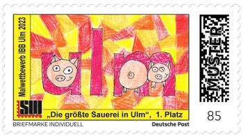 Passend zu den Marken bietet sich der Sonderstempel in Ulm zur MAMA 2023 und der Schweine-Briefmarkenausstellung an.