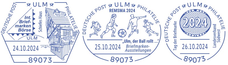 24.10.2024: Zur IBB mit dem Messe-Logo und dem „Schiefen Haus“ in Ulm. 25.10.2024: Zum Grundschulklassen-Malwettbewerb „Ulm, der Ball rollt …“, mit der REMSMA-Ausstellung (Fußballer-Zeichnung von Sophia Wachter). 26.10.2024: Zum Tag der Briefmarke 2024 mit einem an die berühmten brasilianischen „Ochsenaugen“ angelehnten Motiv, passend zur Marke (und Block) ‚America's First‘ vom 4. April 2024. G. Detlev Moratz