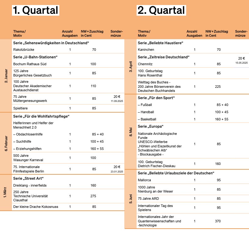 Das Bundesministerium der Finanzen (BMF) veröffentlichte aktuell das Jahresprogamm der deutschen Sonderpostwertzeichen für das Jahr 2025.