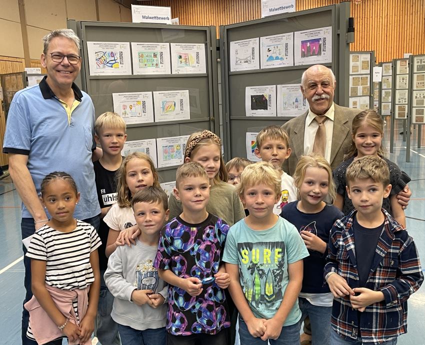 Einige der am Malwettbewerb teilnehmenden Schulkinder vor ihren Werken in den Ausstellungsrahmen.