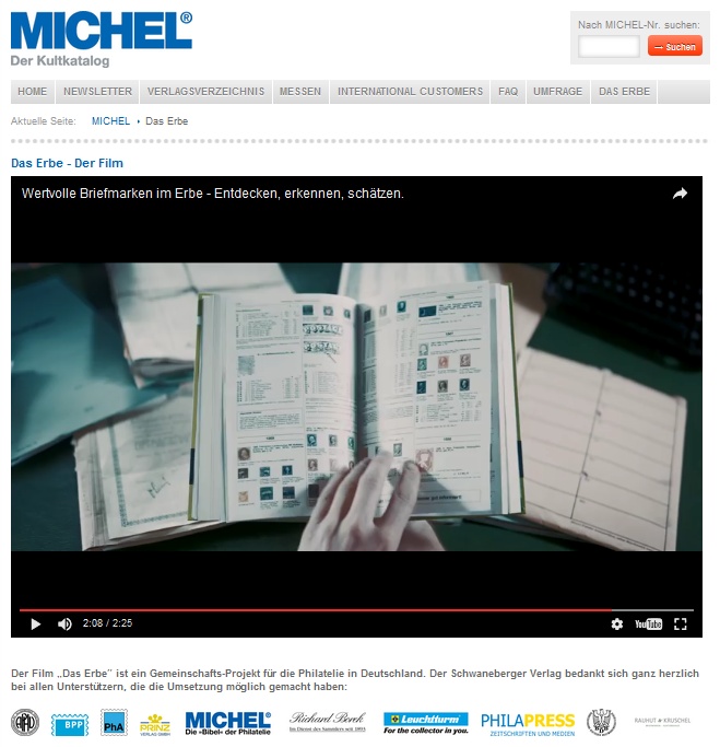 | Meldung vom 23.10.2016: | Schwaneberger Verlag / MICHEL: Professionell gemachter Film "Das Erbe" wirbt für das Biefmarkensammeln |