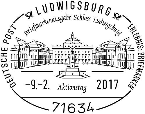 |        Ab 9. Februar 2017 bundesweit an den Postschaltern: Schloss Ludwigsburg Vom 9. bis 11. Februar sind die Briefmarkenvereine Ludwigsburg und Remseck sowie die Deutsche Post mit einem Sonderstempel im Schloss vertreten.