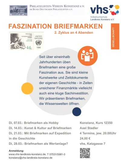 "FASZINATION BRIEFMARKEN" Unter diesem Motto veranstaltet der Philatelisten-Verein Konstanz seinen 2. Zyklus an der Volkshochschule Konstanz.