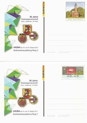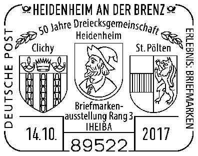 50 Jahre Dreiecksgemeinschaft zwischen Clichy, St. Pölten und Heidenheim ist der Anlass für eine Wettbewerbsausstellung des BDPh im Rang III, welche die Briefmarkenfreunde Heidenheim am 14. und 15. Oktober 2017 ausrichten. Eine Festschrift mit der Städtepartnerschaftsgeschichte ist am 14. und 15.10.2017 im Rathaus kostenlos erhältlich. Vor 50 Jahren wurde von der Philatelisten-Jugend Heidenheim vom 4.-13. Nov. 1967 eine Landesjugend-Briefmarkenausstellung in der Feuerwache in Heidenheim durchgeführt, erstmals mit Vertretern aus St. Pölten, neben den Gästen aus Clichy. Seither treffen sich die Briefmarkenfreunde regelmäßig und tauschen sich aus mit Informationen, Exponaten aber auch mit Briefmarken. Der 47. Partnerschaftskongress ist dieses Jahr mit Gästen aus Clichy, St. Pölten, St. Gilles und Jihlava angesagt. Bei der IHEIBA 2017 (Internationale Heidenheimer Briefmarkenausstellung) werden 41 Sammlungen mit 152 Rahmen (qm), inkl. 13 Exponate mit 33 Rahmen der Jugendklasse, eingeteilt in die Klassen Ländersammlung, Postgeschichte, Luftpost, Ganzsachen und Thematik, gezeigt. Der Schwerpunkt dieser Ausstellung ist die Thematik. Interessante Themen wie „Großeltern - die beste Erfindung seit es Kinder gibt“ oder „Memoiren eines Mörders – das ereignisreiche Leben des Rigoletto“ oder „Pferde im Krieg“ aber auch Ansichtskarten wie „Kinderkleidung im Kaiserreich“ sind sicher sehenswerte Exponate. An beiden Tagen wird die Deutsche Post AG ist mit einem Sonderstempel mit Wappen von Clichy, St. Pölten und Heidenheim vertreten sein. Die Südwest Mail ist ebenfalls mit einem Sonderstempel mit dem Motiv Mammut, 40.000 Jahre Eiszeitkunst UNESCO Weltkulturerbe, mit dabei. Am Sonntag findet der Ostalb-Großtausch statt, sowie eine Vereinsauktion. Helmuth Feichtenbeiner