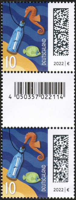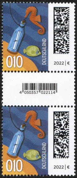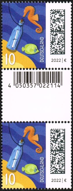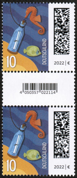 Zunächst die Fakten: Es handelt sich bei der Ausgabe um die Dauermarke „Flaschenpost“ der Serie „Welt der Briefe“, nassklebend ausgegeben in Rollen zu 200 Stück. Michel-Nummer 3723 R, Ausgabetag: 2. November 2022. Jede fünfte Marke ist rückseitig nummeriert, darauf folgt ein kleineres Zwischenfeld mit EAN-Code für die Abrechnung am Schalter. Es gilt als gesichert, dass das Druckdatum auf der Rollenverpackung der "4.12.23" (eventuell weitere Druckdaten mit der 010 sind bislang nicht bekannt).